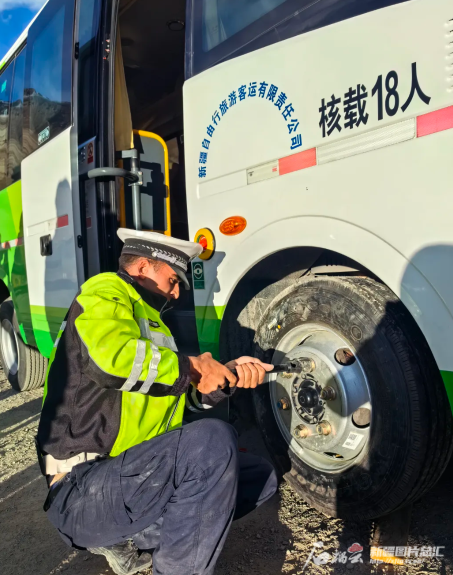 10月4日18时30分,参观完红其拉甫国门景区后,大家集合返程。当日,老人们要住在塔县县城,从红其拉甫国门景区返回住处有两个多小时的车程。当大家乘坐区间车来到停车场时,却看到司机师傅正在气喘吁吁地换轮胎。原来,他们下车后,司机检查车况,发现车的右前轮胎被尖锐物刺破了。司机拿出备胎准备换胎,发现随车的是一个轿车用的千斤顶,高度不够,破损的轮胎取不下来,新胎也就装不上去。