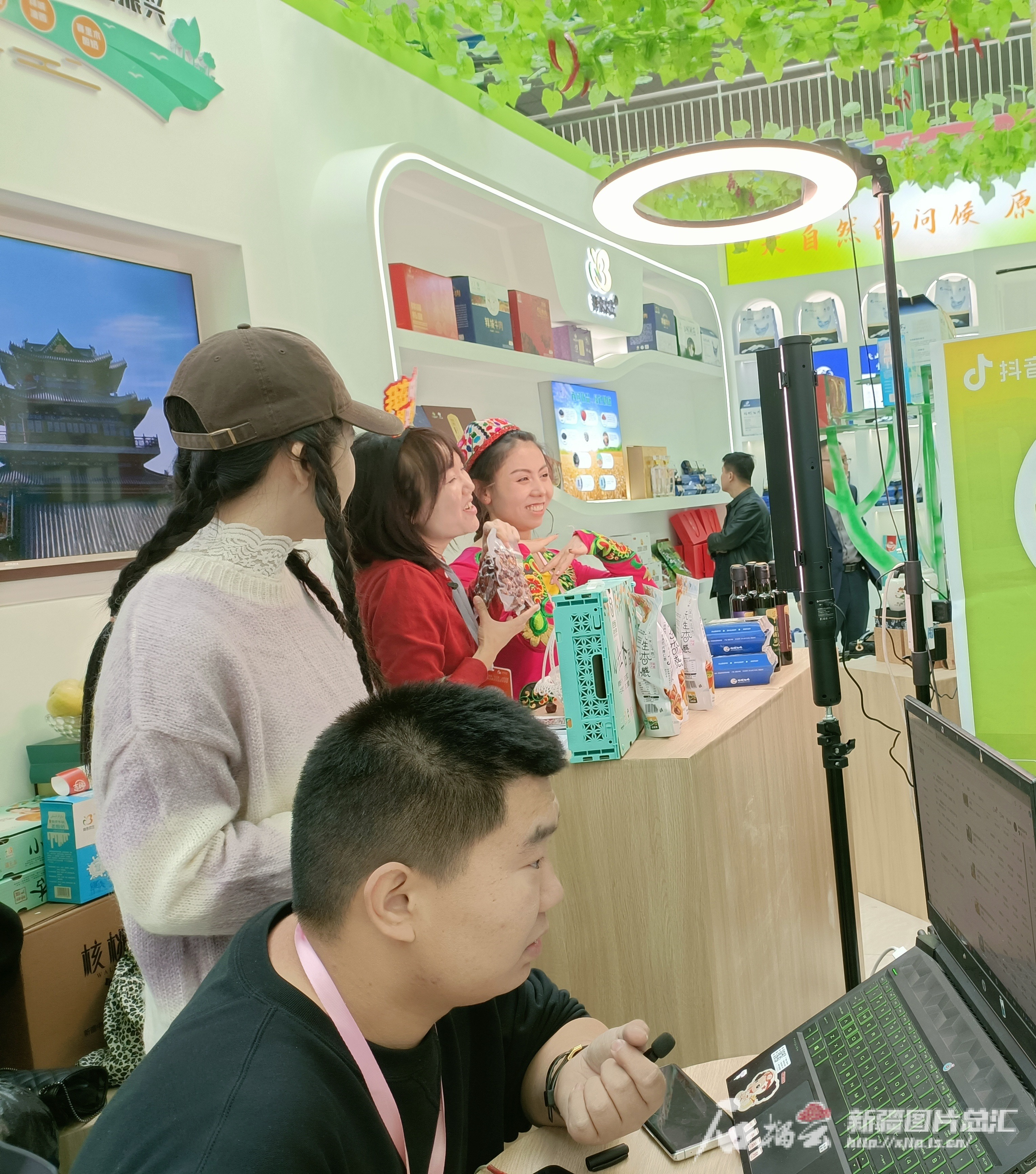 第十届新疆特色果品(阿克苏)交易会上,来自浙江省温州市的带货主播与拜城县电商团队合作,一起推介销售阿克苏特色农产品。天山网-新疆日报记者 陈疆林摄