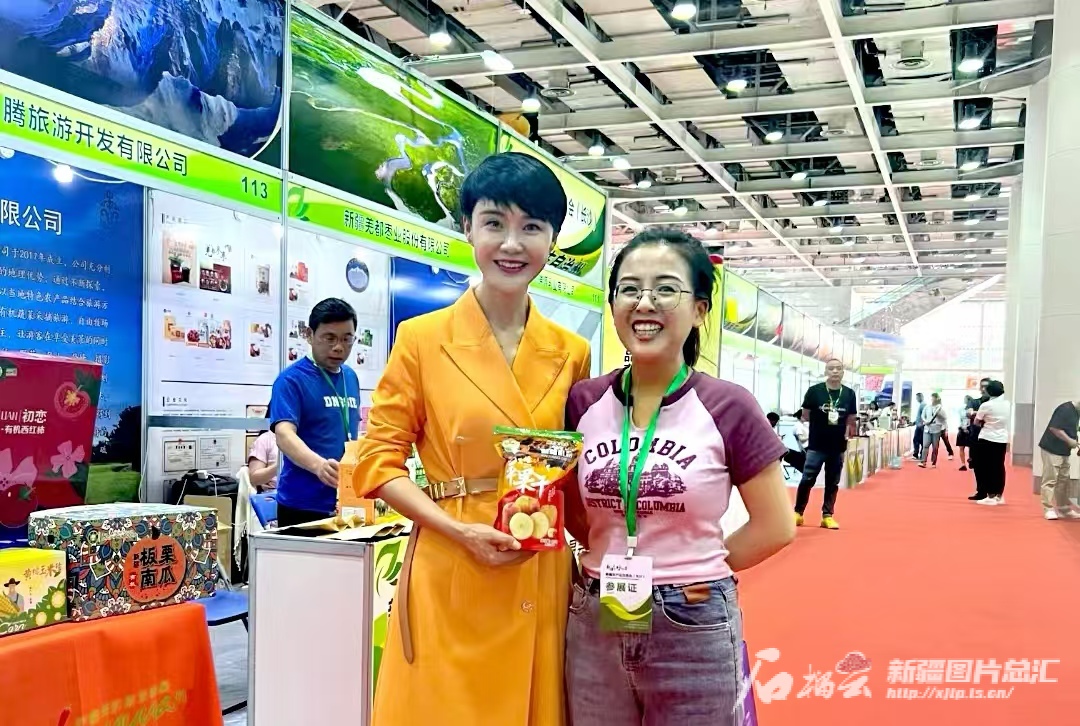 “东楼”苹果干参展商(右)推广产品时,与新疆优质农产品产销服务中心主任贺娇龙合影留念。(资料图)图片由受访者提供