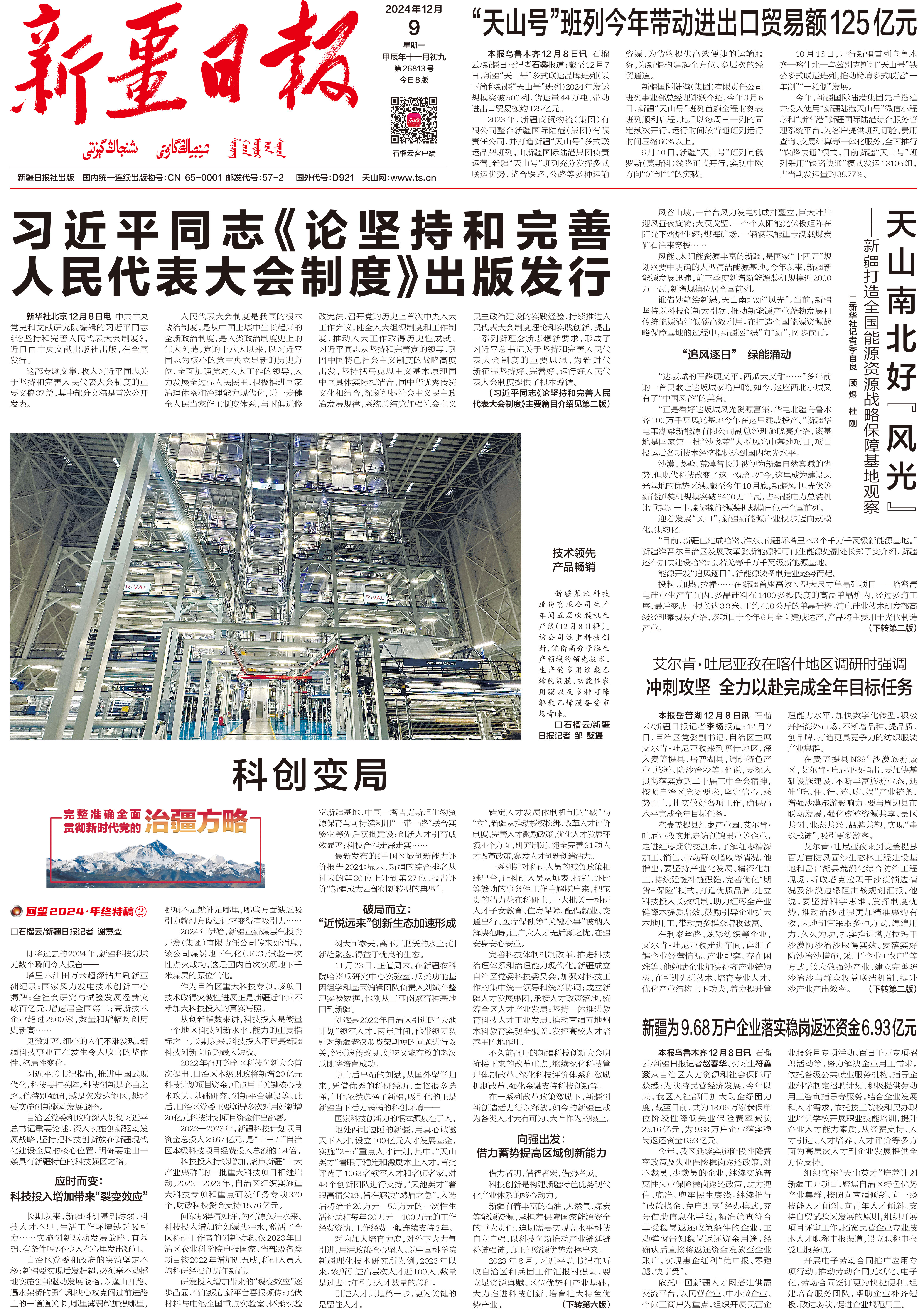 塔里木油田万米超深钻井刷新亚洲纪录;国家风力发电技术创新中心揭牌;全社会研究与试验发展经费突破百亿元,增速居全国第二;高新技术企业超过2500家,数量和增幅均创历史新高……