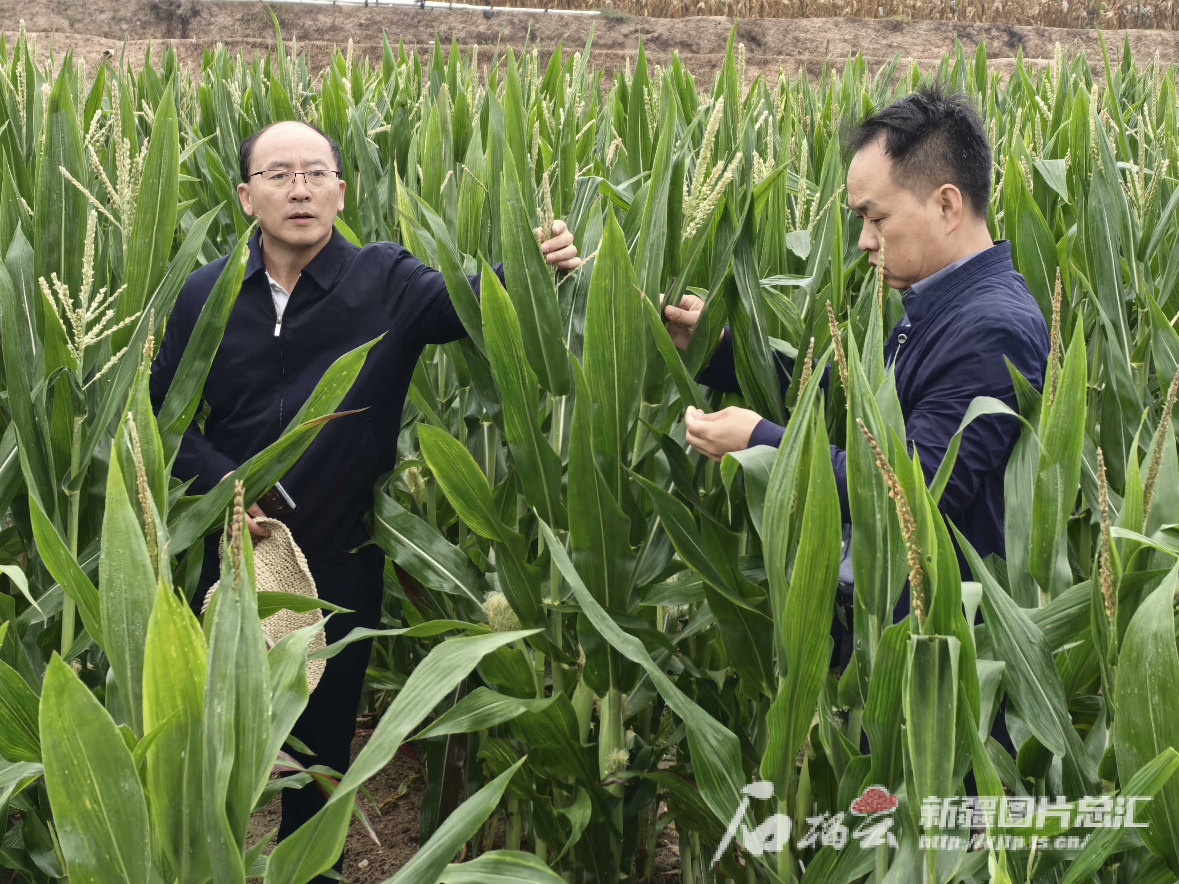 3月19日,在位于海南省三亚市的国家南繁育种基地,新疆天玉种业有限责任公司董事长兼总经理吴洪涛(左)和同事在察看公司试验田里制种玉米的生长情况。受访本人供图