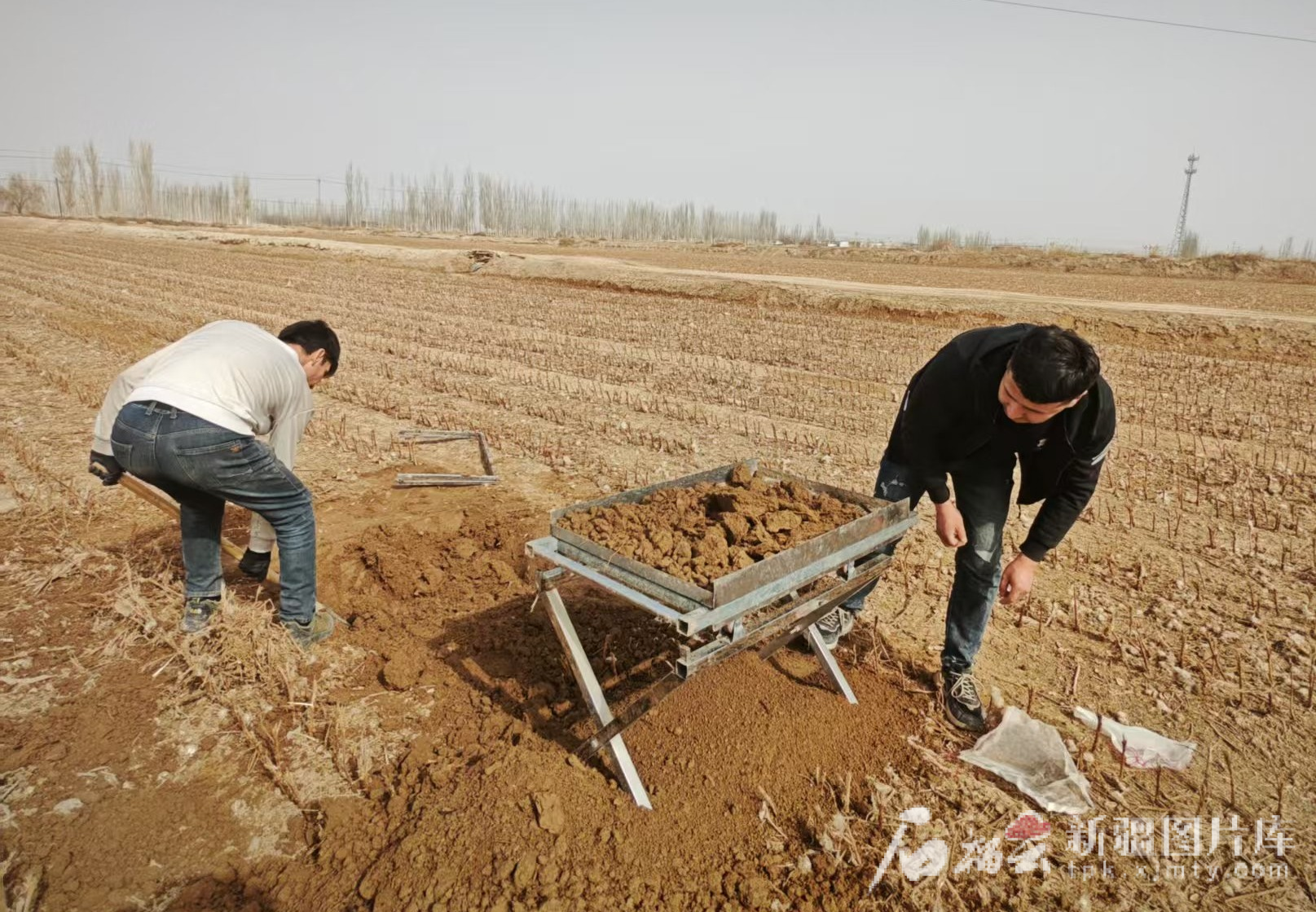 3月18日,在库车市二八台镇拉依苏村棉田地膜残留监测点位,工作人员正在挖取土样。 王红丽摄