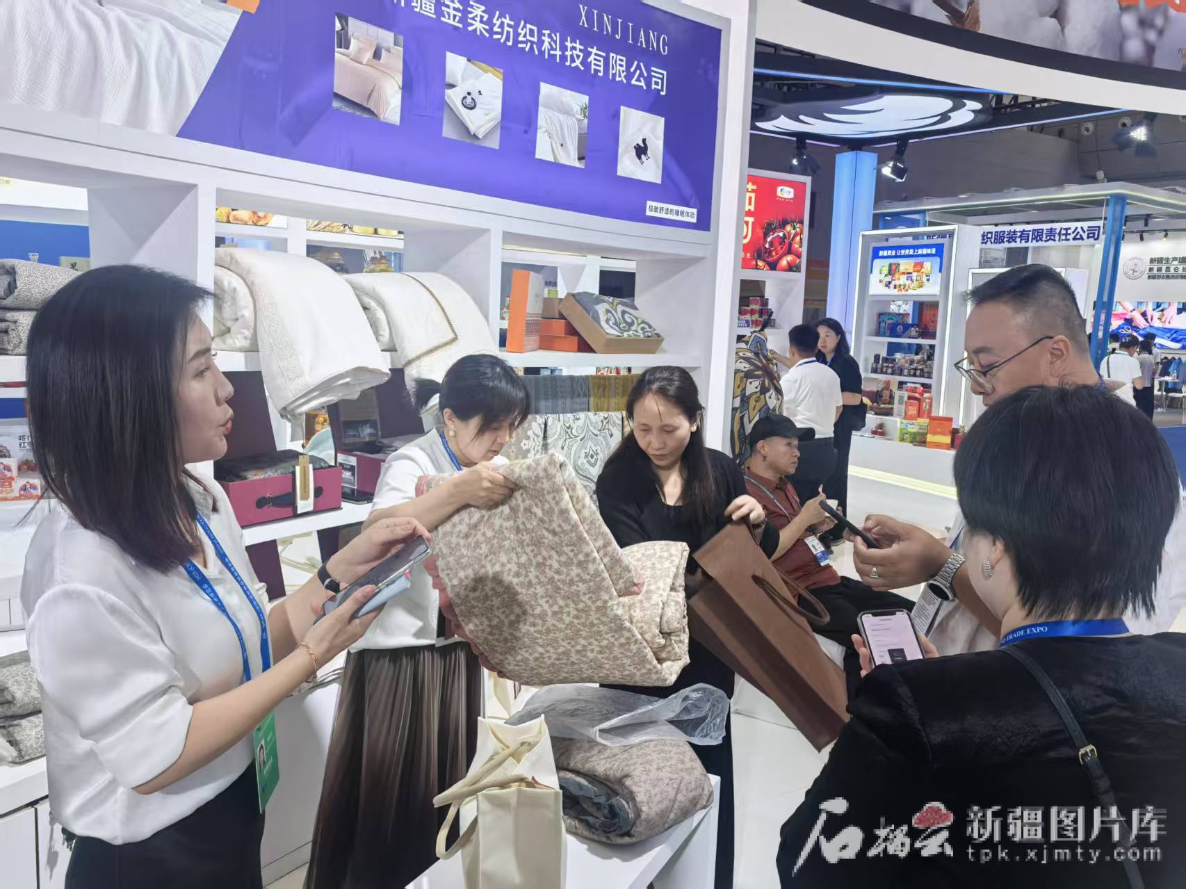 6月26日,在新疆金柔纺织科技有限公司展台前,前来咨询的客商络绎不绝。天山网-新疆日报记者 谢慧变摄