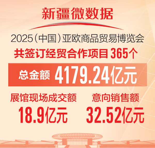 天山网-新疆日报讯(记者黑宏伟报道)记者从7月2日召开的2025(中国)亚欧商品贸易博览会成果新闻发布会上获悉: 2025(中国)亚欧商品贸易博览会共签订经贸合作项目365个,总金额4179.24亿元;展馆现场成交额18.9亿元,意向销售额32.52亿元。