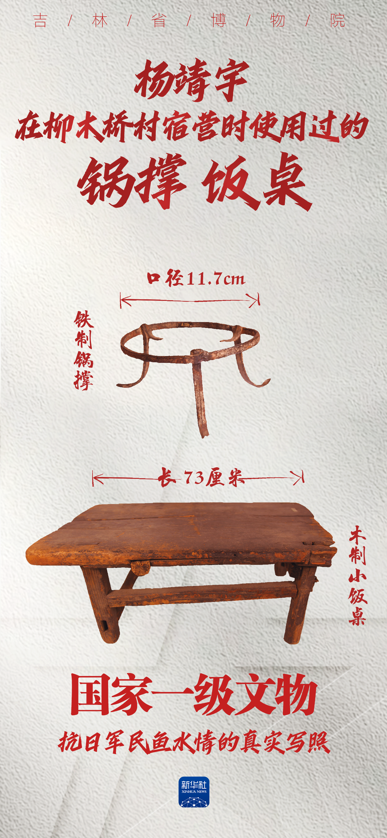 1938年,杨靖宇带领部队在柳木桥山区进行抗日活动时,他的通讯员向当地村民单大娘借了这些生活用具。部队转移时,把物件归还给单大娘。后来日伪军得知此事,气急败坏地烧毁了柳木桥村的房屋,但杨靖宇曾使用过的这几个物件却被抢救保存下来。它们不仅记录了抗联将士的战斗历程,也展现了东北民众对抗联的支持与军民鱼水情深。