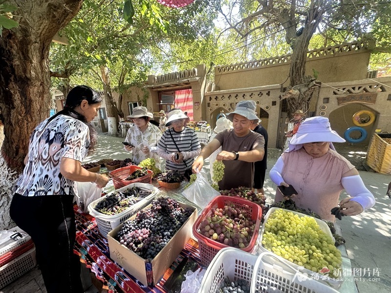 7月9日,吐鲁番市葡萄沟景区,游客在购买鲜食葡萄。 阿地兰摄