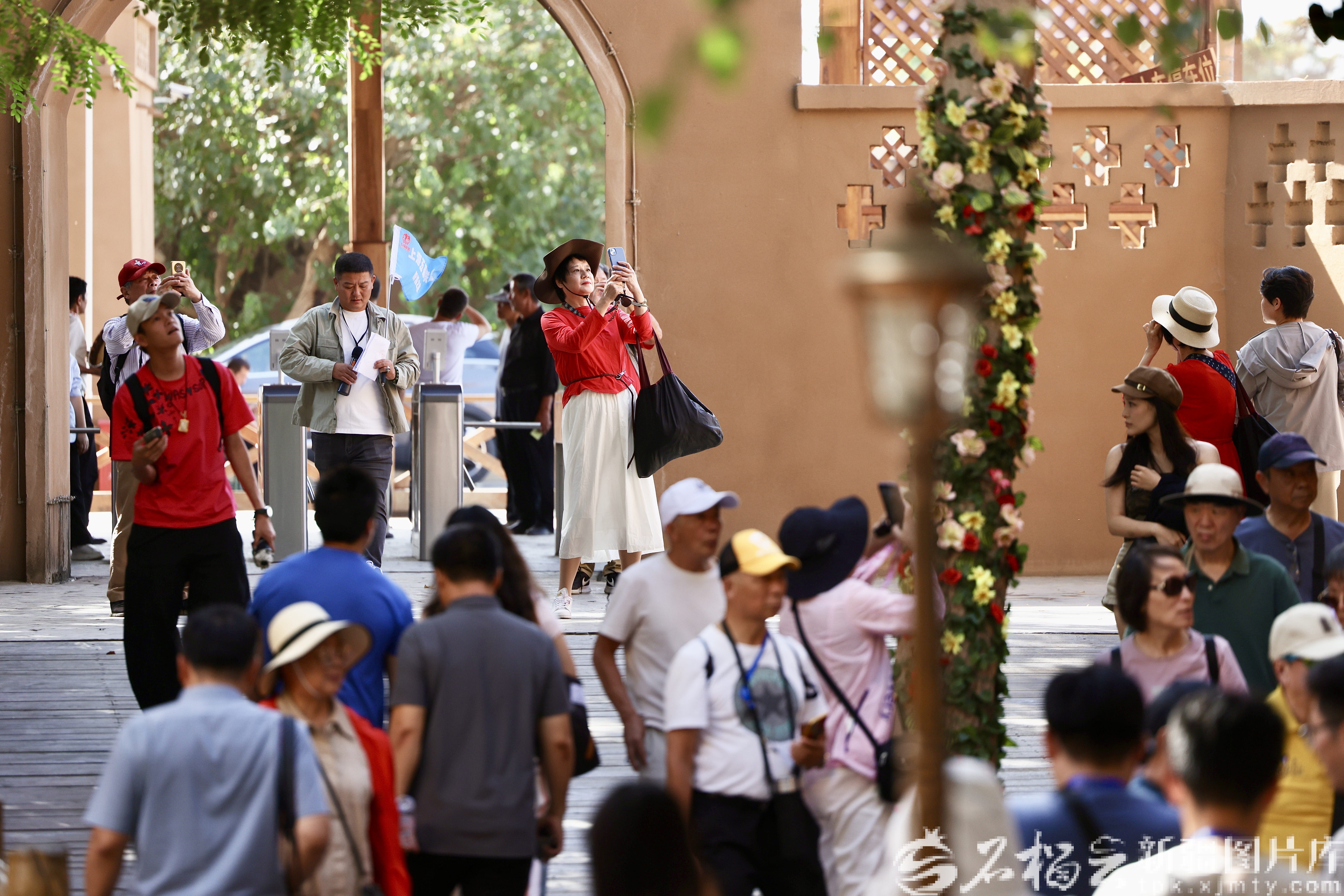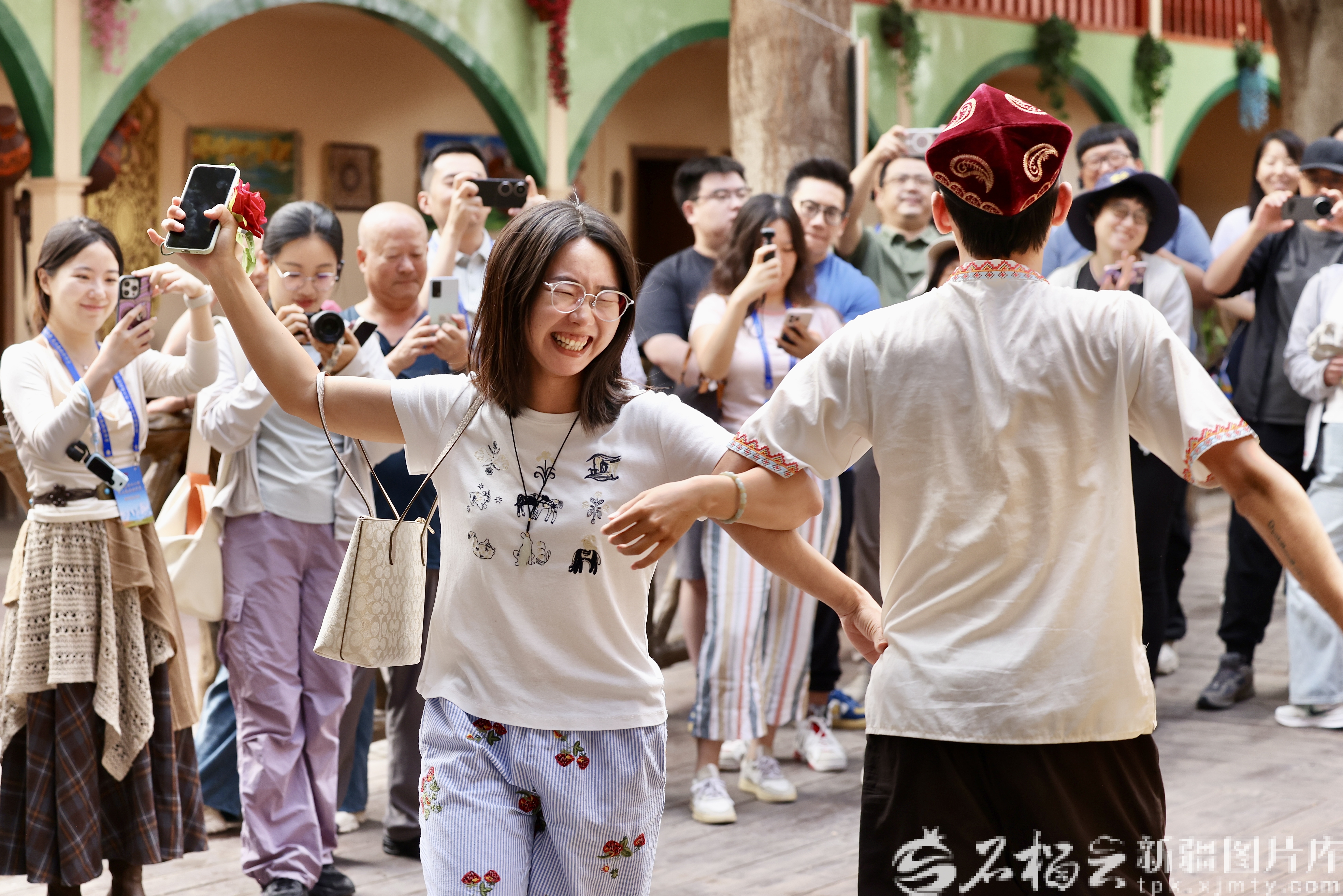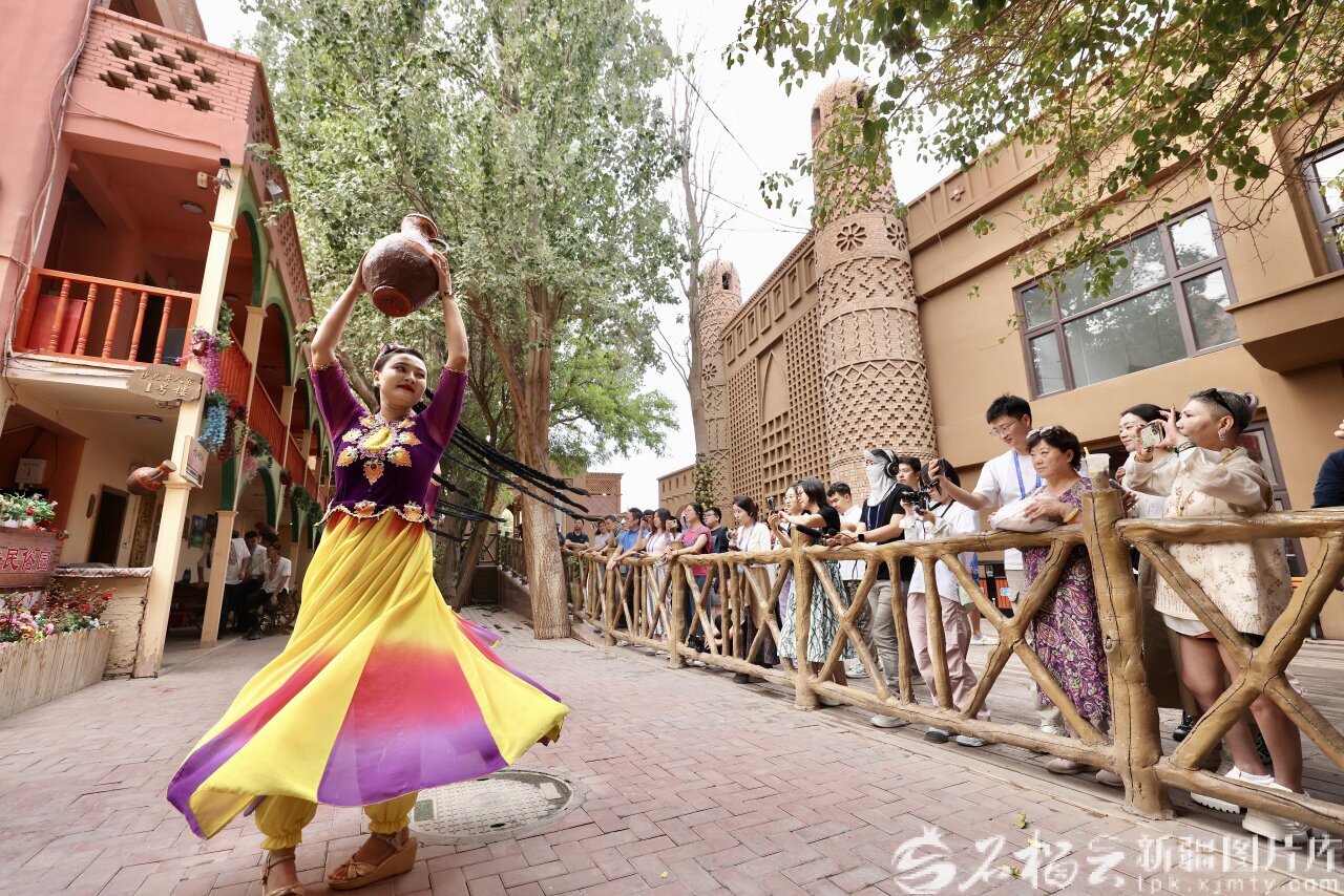 9月10日,坎儿井民俗园,游客与演员一起跳舞。