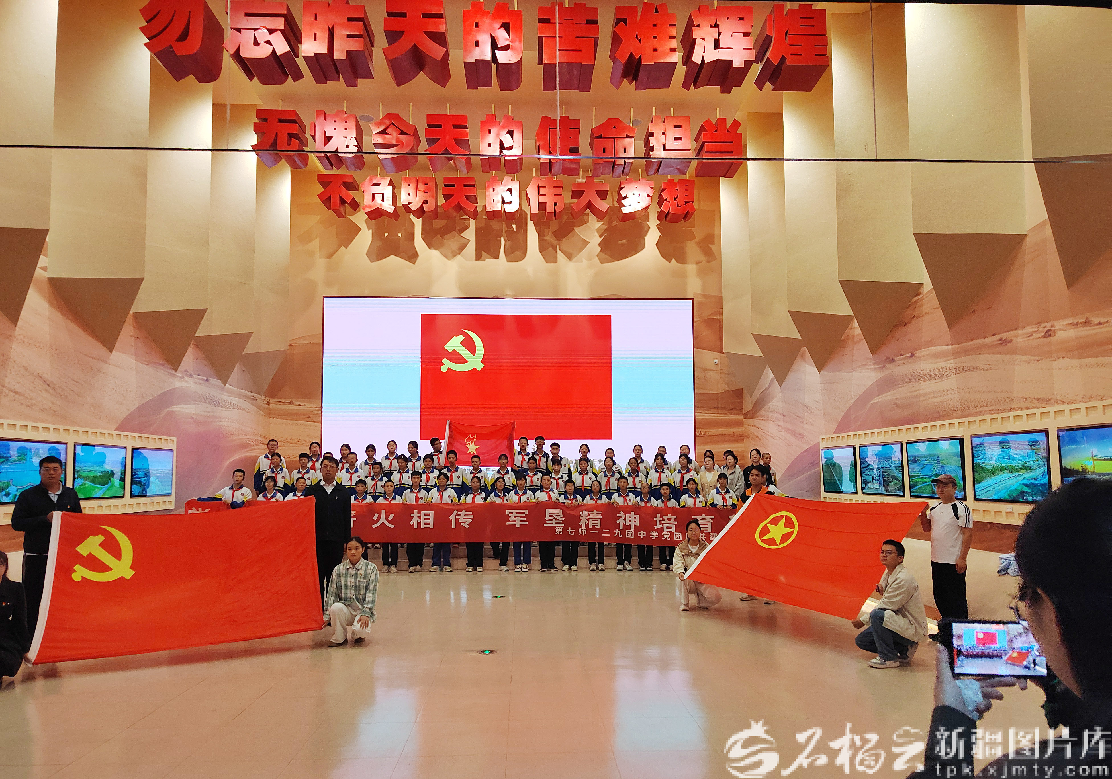9月11日,前来研学的兵团第七师一二九团中学师生在新疆兵团军垦博物馆合影。