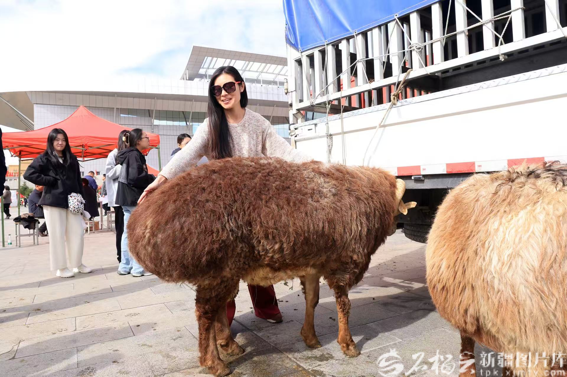 在2025年“中国农民丰收节”阿勒泰市专场活动特色农畜产品之最评选环节中,一位游客与参评的阿勒泰羊合影。阿尔达克·拜斯汗 摄