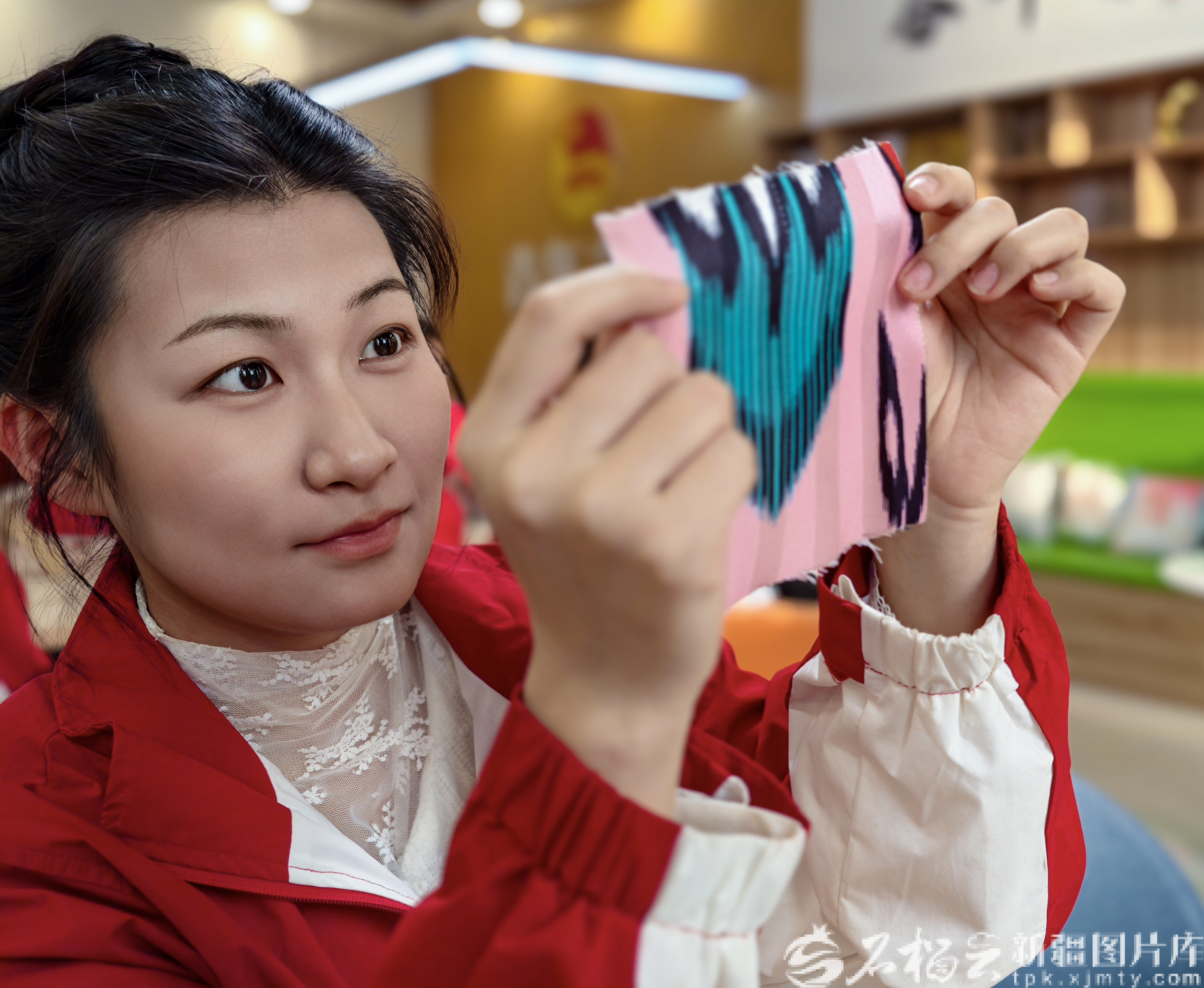 1月17日,一名大学生西部计划志愿者在阿克苏市“青年之家”近距离接触艾德莱斯绸。