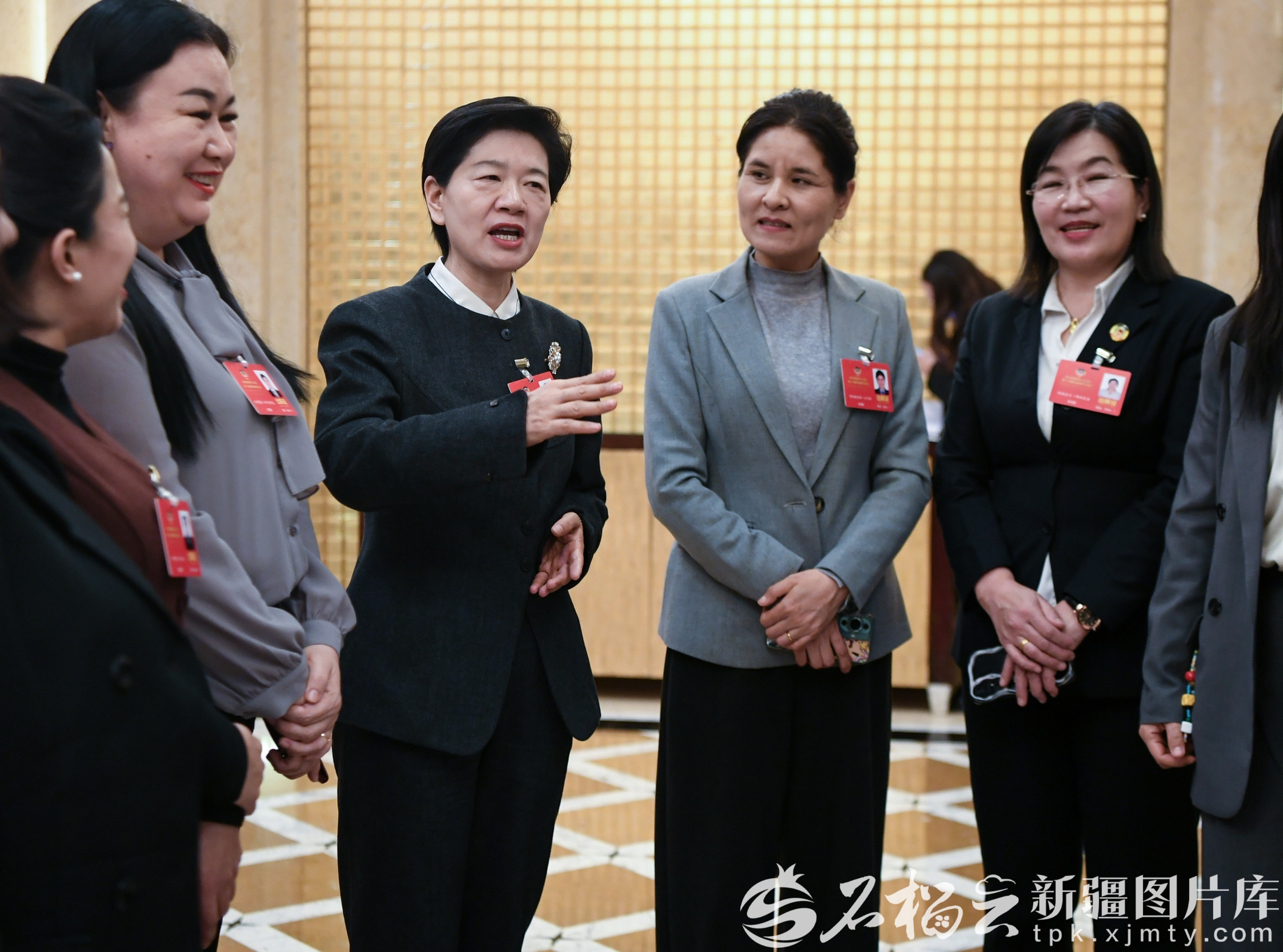 1月27日,农业界、环境资源界委员分组讨论间隙,委员们一起交流。石榴云/新疆日报记者 约提克尔·尼加提摄
