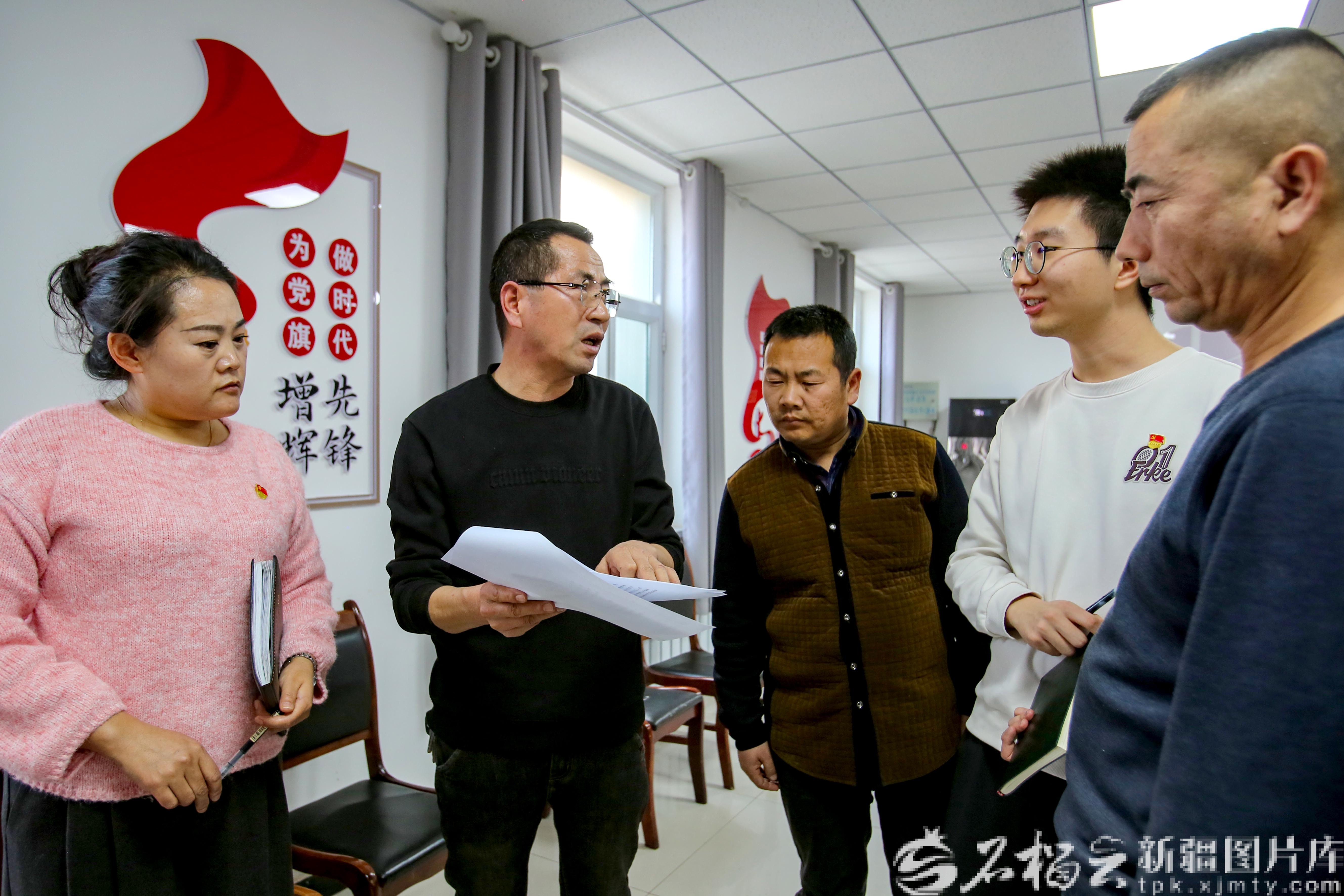 1月13日,王永军(左二)在哈密市伊州区二堡镇宫尚村和村干部商量如何帮助新建成的水产养殖场。