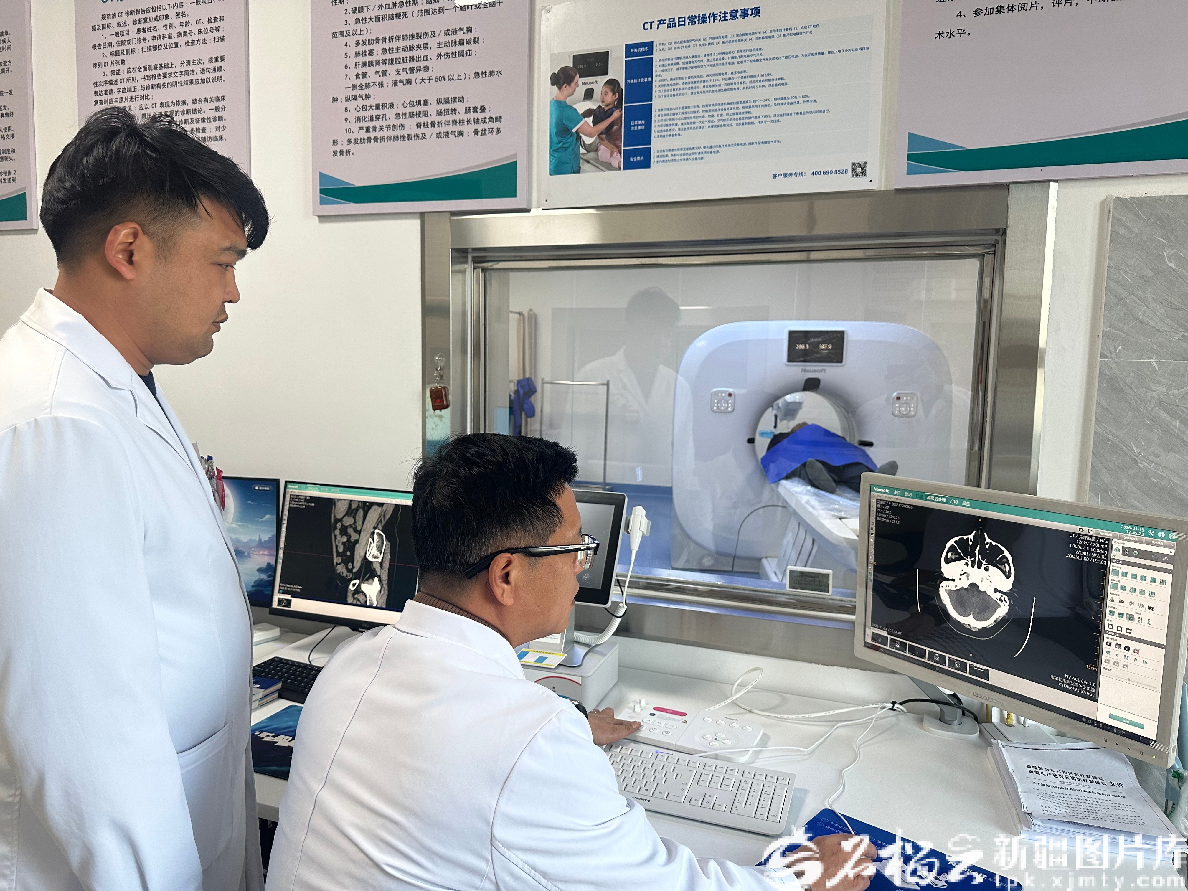1月14日,库尔勒市紧密型医共体总院阿瓦提乡卫生院分院,医务人员在给村民做CT检查。图/阿瓦提乡卫生院提供