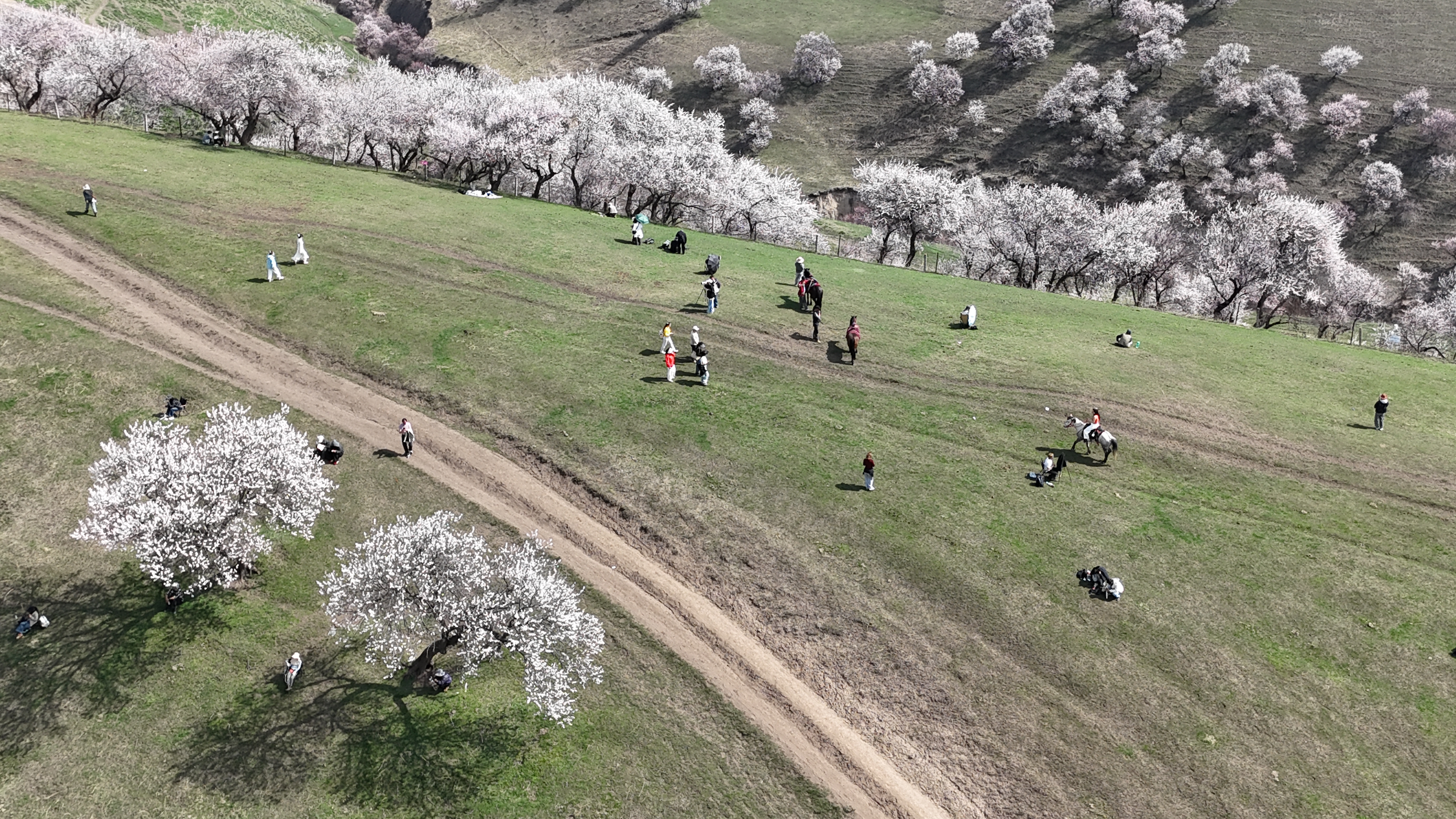 4月2日,新源县那拉提杏花谷,漫山遍野的野杏花层层叠叠、竞相绽放。粉白相间的花瓣随风轻舞,与茵茵绿草、连绵远山相映成趣,勾勒出一幅如诗如画的春日盛景。游客们漫步花间、驻足打卡,在清新的空气中沉醉花海,尽享踏青赏春的惬意与美好。